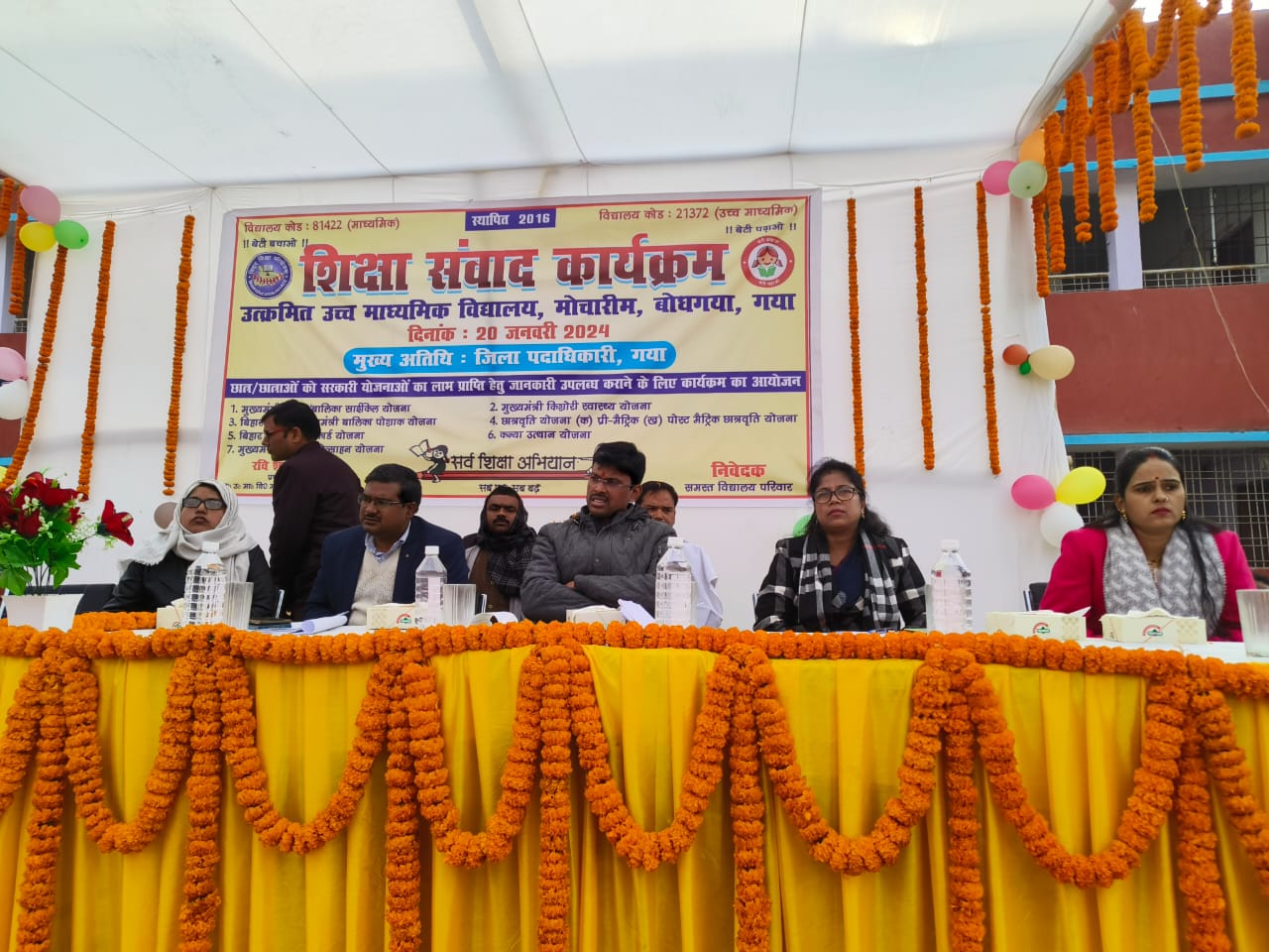 गया। उत्क्रमित उच्च विद्यालय मोचरिम, बोधगया में शिक्षा संवाद कार्यक्रम का आयोजन किया गया है। इस आयोजन का शुभारंभ जिला पदाधिकारी गया डॉ० त्यागराजन एसएम द्वारा दीप प्रज्वलित कर किया गया है। जिला पदाधिकारी ने अपने संबोधन में उपस्थित सभी छात्र-छात्राओं एवं उनके अभिभावकों के साथ-साथ सभी उपस्थित शिक्षकों को भी बिहार सरकार द्वारा सभी छात्र-छात्राओं एवं उच्च शिक्षा प्राप्त करने वाले सभी छात्र-छात्राओं के लिए संचालित विभिन्न योजनाओं से अवगत करवाया गया है। शिक्षा विभाग द्वारा हर कक्षाओं के लिए हर वर्ग के लिए विभिन्न योजनाएं संचालित है।उसके बारे में लोगों को बताया गया है। उनके भविष्य में जिस भी योजनाओं को लाभ लेकर के कैसे आगे बढ़ा जाए, इसके लिए विस्तार से बताया गया है। जिस क्षेत्र में भी वह आगे बढ़ना चाहते हैं उन सभी योजनाओं से संबंधित सभी बातों को विस्तार से बताया गया है। शिक्षा से संबंधित कई विभिन्न वीडियो के माध्यम से भी योजनाओं के बारे में जानकारी दी गई है। अभिभावको एवं छात्रों से भी कई फीडबैक भी प्राप्त किए गए हैं। जो भी फीडबैक प्राप्त हुए हैं उसे लेकर छात्र-छात्राओं के लिए और व्यवस्थाएं दुरुस्त किया जाएगा। जिला प्रशासन का उद्देश्य है कि सभी व्यवस्थाएं एव सुविधाएं लोगों को मुकम्मल रूप से मिले उसको प्राप्त करके बच्चे और आगे बढ़े। अच्छे से पढ़ाई कर अपने प्रखंड का गांव का जिला का एवं राज्य का नाम रोशन करें। इस अवसर पर जिला शिक्षा पदाधिकारी, प्रखंड विकास पदाधिकारी, अंचलाधिकारी सहित अन्य पदाधिकारी के साथ साथ बच्चे एव अभिभावक उपस्थित थे।