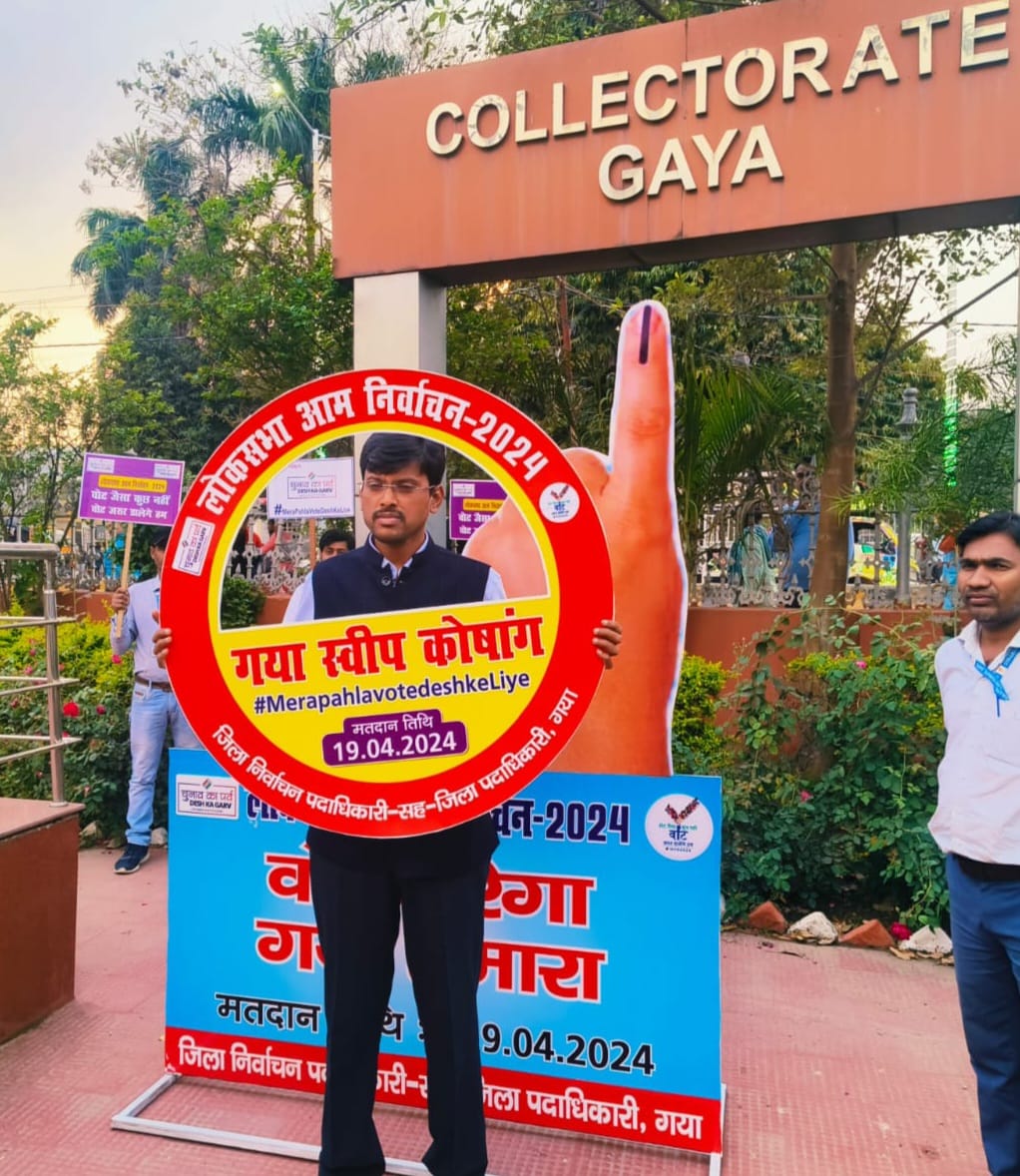 गया।लोकसभा आम निर्वाचन ,2024 के अवसर पर स्वीप कोषांग के द्वारा आमलोगो के बीच लगातार मतदाता जागरूकता अभियान चलाया जा रहा है। इसी क्रम में समाहरणालय परिसर में सेल्फी प्वाइंट का उदघाटन ज़िला पदाधिकारी के द्वारा किया गया है। इस दौरान अपर समाहर्ता परितोष कुमार, अपर समाहर्त्ता पंकज कुमार,स्वीप कोषांग की नोडल पदाधिकारी भारती प्रियम्बदा, जिला सूचना जन संपर्क पदाधिकारी सहित बाल विकास परियोजना पदाधिकारी कोंच, मंजु कुमारी एवं स्वीप कोषांग के कर्मीगण भी उपस्थित रहे हैं। सेल्फी प्वाइंट स्थापित करने का उद्देश्य है कि मतदाताओं को मतदान हेतु अधिक से अधिक प्रेरित किया जाए। इसके साथ ही चुनाव के महापर्व में सभी मतदाता सक्रिय भागीदारी दर्ज करें एवं उनमें मतदान का उत्साह पैदा हो।सेल्फी प्वाइंट के माध्यम से ज़िला पदाधिकारी ,गया ने “वोट करेगा गया हमारा ” संदेश के माध्यम से वोट डालने की अपील की। इस दौरान कई लोगों ने अपना सेल्फी लिया है ।