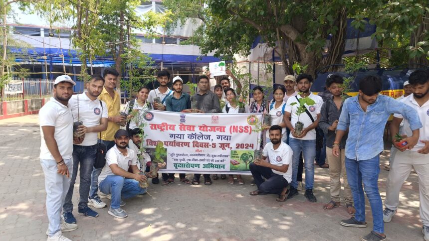 गया।राष्ट्रीय सेवा योजना, गया कॉलेज, गया के द्वारा 5 जून को विश्व पर्यावरण दिवस के अवसर पर एक वृक्षारोपण अभियान चलाया गया है ।गया कॉलेज के प्रधानाचार्य डॉ सतीश सिंह चंद्र के निर्देश पर वृक्षारोपण का कार्यक्रम गया कॉलेज परिसर में विभिन्न स्थलों पर पौधों को लगाकर स्वयंसेवकों के द्वारा किया गया है। इस कार्यक्रम का संचालन गया कॉलेज गया के एनएसएस यूनिट~ एक के कार्यक्रम पदाधिकारी डॉ राजेश कुमार मिश्र के द्वारा किया गया है। उन्होंने स्वयंसेवकों को वृक्षारोपण से होने वाले लाभ और विश्व के बढ़ते हुए तापमान को नियंत्रित करने में पेड़ों की भूमिका के बारे में चर्चा की गई है।आज लगातार पृथ्वी का तापमान तेजी से बढ़ रहा है, भारत के विभिन्न स्थानों पर तापमान 48 से 52 डिग्री सेल्सियस तक पहुंच चुका है, इससे पूरी मानवता खतरे में आ गई है। इस खतरे को दूर करने का सबसे आसान और सरल तरीका वृक्षारोपण के माध्यम से देश में हरियाली को बढ़ाना है ताकि वृक्ष ज्यादा से ज्यादा कार्बन को सोख सके और तापमान को नियंत्रित कर सके। जलवायु परिवर्तन पर होने वाले सम्मेलनो में इस बात पर ज्यादा बल दिया जाता है कि सभी लोग ज्यादा से ज्यादा वृक्षारोपण करें ताकि मानवता की रक्षा की जा सके। वृक्षारोपण अभियान में स्वयंसेवक एवं स्वयं सेविकाओं में बढ़-चढ़कर भाग लिया। इसमें आरभ, आर्यन कुमार,सौरव कुमार,राहुल राज,हर्ष कुमार, रोशनी कुमारी, उरूज़ ताकिर,रोहित रंजन, दिव्या भारती, मो इश्तियाक आलम, समीक्षा राज, शुभम कुमार, प्रिंस कुमार, ज्ञानशीष कुमार ,अमित कुमार ,कुणाल कुमार ,कुंदन कुमार, मोनू कुमार,सत्यम कुमार अभिजीत सिंह, विनायक कुमार राहुल कुमार, शुभम कुमार ,राहुल कुमार ने सहभागिता की है।