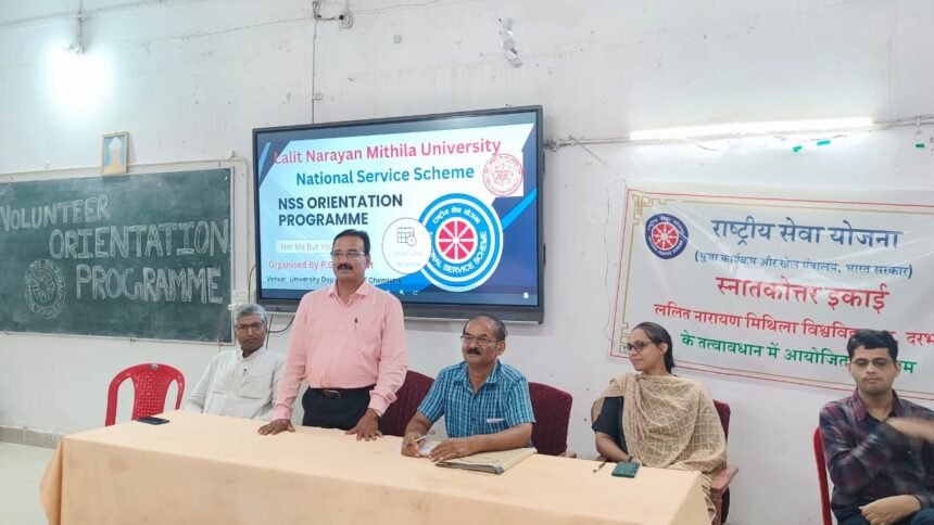 ललित नारायण मिथिला विश्वविद्यालय, दरभंगा की स्नातकोत्तर एनएसएस इकाई के तत्वावधान में विश्वविद्यालय रसायनशास्त्र विभाग में “वालंटियर्स ओरिएंटेशन प्रोग्राम” का आयोजन प्रभारी विभागाध्यक्ष प्रो संजय कुमार चौधरी की अध्यक्षता में आयोजित किया गया, जिसमें मुख्य वक्ता के रूप में एनएसएस कोषांग के कार्यक्रम समन्वयक डॉ आर एन चौरसिया, पीजी यूनिट के कार्यक्रम पदाधिकारी डॉ सोनू राम शंकर, विश्वविद्यालय चुनावी साक्षरता क्लब की सहसंयोजिका डॉ लक्ष्मी कुमारी, शिक्षक डॉ अभिषेक राय, स्वयंसेवक- अक्षय कुमार झा, सुमेधा, अंशु, पूजा, रेश्मि, नव्या, पद्मा, सरोज, मनोज, संजना, प्रिंस, विशाल, निकिता, समरेश, रिंकी, केशव, आदित्य, नेहा, रामकृपाल, अनीश तथा ऋचा कुमारी सहित 30 से अधिक व्यक्ति उपस्थित थे।
