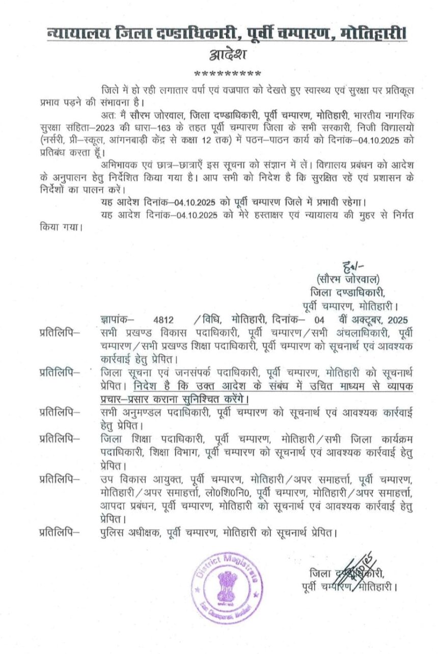 मोतिहारी। पूर्वी चम्पारण के जिलाधिकारी सौरभ जोरवाल ने आज विद्यालयों में प्रतिबंधित छुट्टी का ऐलान करते हुए पत्र जारी कर दिया है।