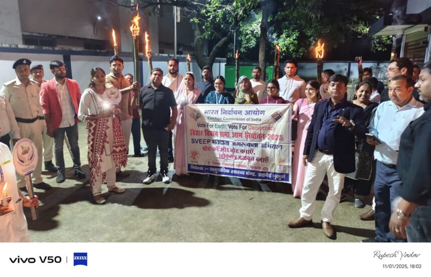 वैशाली। सामुदायिक स्वास्थ्य केंद्र सहदेई बुजुर्ग में कर्मियों ने मतदान जागरूकता रैली निकाला जिसमें सभी कर्मी, चिकित्सा पदाधिकारी तथा एएनएम स्कूल की छात्राओं ने भाग लिया। कर्मियों ने मसाल जुलूस निकालकर स्वास्थ्य केंद्र से स्टेशन तक रैली निकाली जिसमें सैकड़ो कर्मियों ने अपनी भागीदारी पेश की कर्मियों ने लोगों से अपील किया की ज्यादा से ज्यादा लोग आने वाले आगामी चुनाव 6 नवंबर को अपने वोट मत अधिकार का प्रयोग करे। प्रभारी चिकित्सा पदाधिकारी ने बताया की जिला पदाधिकारी के आदेश के आलोक में हम लोगों ने मतदाता जागरूकता अभियान के तहत यह है रैली का आयोजन किया गया जिसमें डॉ अभिषेक रंजन डॉक्टर रेखा प्राचार्य नेहा कुमारी स्वास्थ्य प्रबंधक मोहम्मद नासिर हुसैन, को विजयलक्ष्मी शाइस्ता प्रवीण संजू कुमारी एवं अन्य सभी कर्मियों तथा छात्राओं ने भाग लिया। इस पूरे कार्यक्रम का संचालन रितेश कुमार लेखा प्रबंधक द्वारा किया गया। श्री कुमार ने बताया की जिला कार्यक्रम प्रबंधक तथा सिविल सर्जन वैशाली के नेतृत्व में हम सभी ने इस रैली के जरिए लोगों को प्रेरित करने में सफल हो रहे हैं इससे वैशाली जिले का वोट प्रतिशत में काफी बढ़ोतरी होगी।