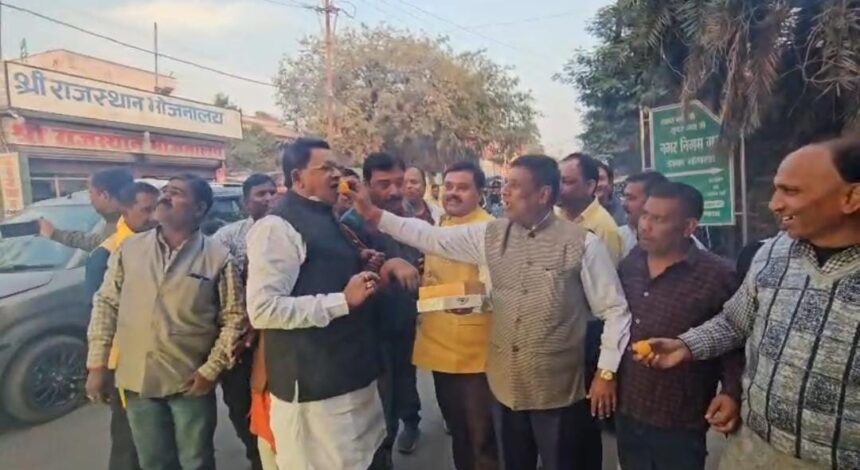 , ऋषि लोहानी , धीरज गुप्ता,एक दूसरे को मुंह मीठा करा कर खुशी के इजहार किया गया है।