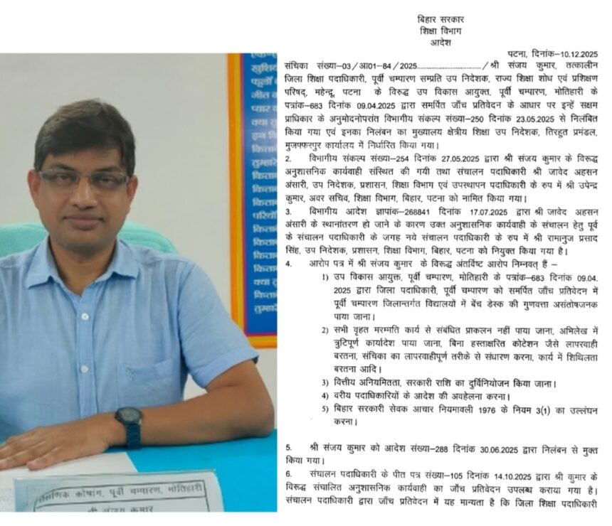 गौरतलब हो कि शिक्षा विभाग के निदेशक प्रशासन मनोरंजन कुमार ने अपने पत्र 333301 दिनांक 10 दिसंबर 25 से डीईओ संजय कुमार के विरुद्ध कुल 5 विन्दुओं पर आरोप सत्य बारकरार रखते हुए बिहार सरकारी सेवक नियमावली 2005 के संशोधित नियम 14 (v) के प्रावधानों के तहत संचयी प्रभाव के बिना एक वेतन वृद्धि अवरुद्ध करने की शास्ति अधिरोपित/संसूचित किया गया है।