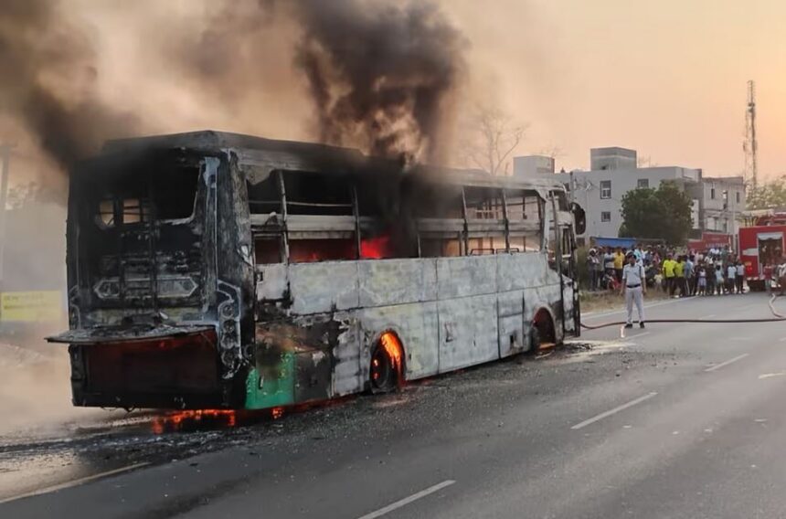 - ड्राइवर की तत्परता से 40 यात्री सुरक्षित बचा लिये गये, लेकिन बस जलकर खाक हो गयी. शॉर्ट सर्किट या डीजल लीक होने से आग लगने की आशंका जताई जा रही है