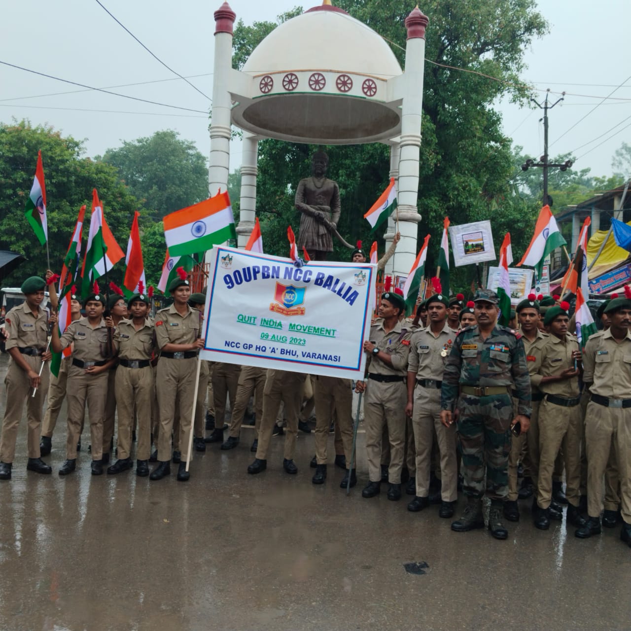 90 यूपी बटालियन एनसीसी बलिया के प्रशासनिक अधिकारी लेफ्टिनेंट कर्नल आर एस पूनिया, प्रशासनिक अधिकारी के निर्देशन में आज दिनांक 9 अगस्त 2023 को क्विट इंडिया मूवमेंट के अंतर्गत रैली निकाली गई, जो बटालियन से प्रारंभ होकर कुंवर सिंह चौराहा होते हुए टीडी कॉलेज चौराहा एवं जिला मुख्यालय से होकर गुजरी। इस दौरान जनता में संदेश गया कि भारत छोड़ो आंदोलन 1942 गांधी जी के तीन सबसे प्रमुख आंदोलन में से एक था (उनके अन्य दो आंदोलन थे 1920- 22 असहयोग आंदोलन एवं 1930 का सविनय अवज्ञा आंदोलन)। जैसा कि नाम से स्पष्ट है इस आंदोलन में पूर्ण स्वराज की मांग प्रबलता से रखी गई। एक अंतरिम सरकार बनाने का सुझाव दिया गया, और अंग्रेजी राज का भारत से समाप्ति के लिए अंतिम आवाहन किया गया। इस आंदोलन को अगस्त क्रांति के नाम से भी जाना जाता है। क्योंकि यह 9 अगस्त 1942 को शुरू हुआ था। 14 जुलाई 1942 को वर्धा में हुई कांग्रेस की कार्य समिति की बैठक में गांधी जी को आंदोलन की औपचारिक शुरुआत के लिए अधिकृत किया गया। 8 अगस्त 1942 को मुंबई में कांग्रेस कार्यकारी समिति की बैठक हुई जिसमें अंग्रेजों से भारत छोड़ने और एक काम चलाऊ सरकार की गठन की बात की गई । क्विट इंडिया मूवमेंट के अंतर्गत पौधा रोपण किया गया, तथा कैडेटों ने राष्ट्रीय गीत गया। इस रैली को सफल बनाने में 90 यूपी बटालियन के सूबेदार रमेश बहादुर आले और ट्रेनिंग जेसीओ नायब सूबेदार जगबीर सिंह के साथ 4 पीआई स्टाफ और 82 कैडेटों ने बढ़ चढ़कर हिस्सा लिया