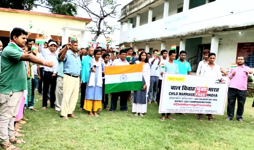 भारत नेपाल सीमा रक्सौल/ मोतिहारी : प्रयास जुवेनाइल एड सेंटर पूर्वी चंपारण के द्वारा नोबल शांति पुरस्कार से सम्मानित कैलाश सत्यार्थी के आह्वान पर पुरे भारत मे स्वतंत्रता दिवस के पूर्व संध्या पर बाल विवाह के विरोध मे विभिन्न जगहो पर कार्यक्रम का आयोजन किया गया जिसमे प्रखंड विकास पदाधिकारी आदापुर सुनील कुमार द्धारा सपथ कर लोगो को को जागरूक किया गया वहीं प्रयास जुवेनाइल एड सेंटर पूर्वी चंपारण की जिला परियोजना समन्वयक आरती कुमारी देख रेख में कार्यक्रम किया गया इस के दौरान भिन्न-भिन्न गांव मे समुदाय के लोगो के साथ एवं स्कूल में बच्चे बच्चियों का रैली निकाल कर जागरुक कर बाल विवाह न करने और न कराने की शपथ दिलाई दिलाई गई/ रक्सौल एवं मोतिहारी अनुमंडल के अंतर्गत भिन्न भिन्न प्रखण्ड रक्सौल, आदपुर, छौरादानो, मोतिहारी, सगौली, रामगढ़वा मे प्रयास संस्था कार्यक्रम का आयोजन किया / भारत ने पिछले कुछ दशकों में बाल विवाह की बुराई को रोकने की दिशा में उल्लेखनीय प्रगति की है लेकिन आंकड़े बताते हैं कि स्थिति अभी भी गंभीर है। नेशनल फैमिली हेल्थ सर्वे की 2019-21 की रिपोर्ट के अनुसार देश में 20 से 24 आयु वर्ग में आने वाली 23.3 फीसद महिलाएं ऐसी हैं जिनका 18 साल से पहले ही विवाह कर दिया गया था। आंकड़े बताते हैं कि बाल विवाह के मामलों में पश्चिम बंगाल शीर्ष पर है जबकि इसके बाद बिहार और त्रिपुरा का नंबर है। गरीबी और अशिक्षा इसके पीछे प्रमुख कारण हैं लेकिन जागरूकता की कमी और रूढ़िवादी सोच भी काफी हद तक जिम्मेदार हैं।