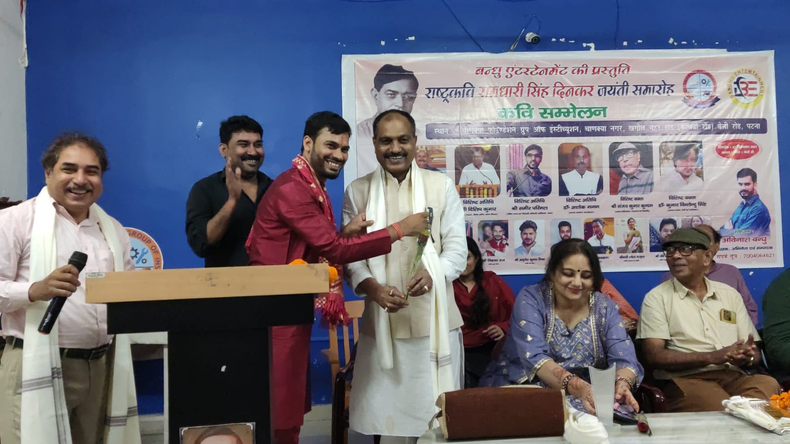 पटना, राष्ट्र कवि रामधारी सिंह दिनकर जयंती के अवसर पर चाणक्या ग्रुप आफ इंस्टिट्यूशन संस्थान के सभागार में बन्धु एंटरटेनमेंट के द्वारा भव्य कवि सम्मेलन का आयोजन किया गया। मुख्य अतिथि के रूप में संजय कुमार कुन्दन मुख्य वक्ता के रूप में डॉ कुमार विमलेंदु सिंह विशिष्ट अतिथि के रूप में समीर परिमल एवं डाॅ अशोक गगन एवं बड़ी संख्या में चाणक्या संस्थान के कर्मचारी और छात्र/छात्राएँ मौजूद थे । आमंत्रित कवियों /शायरों में समीर परिमल,मो नसीम अख़्तर, डॉ कुमार विमलेंदु सिंह ,डॉ रुबी भूषण ,आराधना प्रसाद ,श्वेता ग़ज़ल ,अविनाश भारती ,रवि किशन,अविनाश बंधु, अमृतेश मिश्रा ,विकास राज, सत्य प्रकाश, अनिकेत पाठक ने एक से बढ़कर एक रचनाओं की बेहतरीन प्रस्तुति दी जिसपर श्रोताओं की तालियाँ लगातार बजती रहीं।