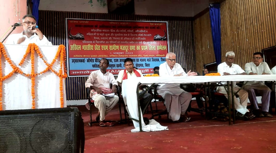 मोतिहारी : अखिल भारतीय खेत एवम ग्रामीण मजदूर सभा का प्रथम जिला सम्मेलन आज कॉमरेड केदार प्रसाद सभागार,कॉमरेड रामप्रताप पासवान मंच नगर भवन मोतिहारी में संपन्न हो गया। सम्मेलन की शुरुआत कॉमरेड मोहन राम ने झंडोतोलन करके किया।तत्पश्चात शहीद व दिवंगत साथियों को एक मिनट की मौन श्रद्धांजलि अर्पित की गई।