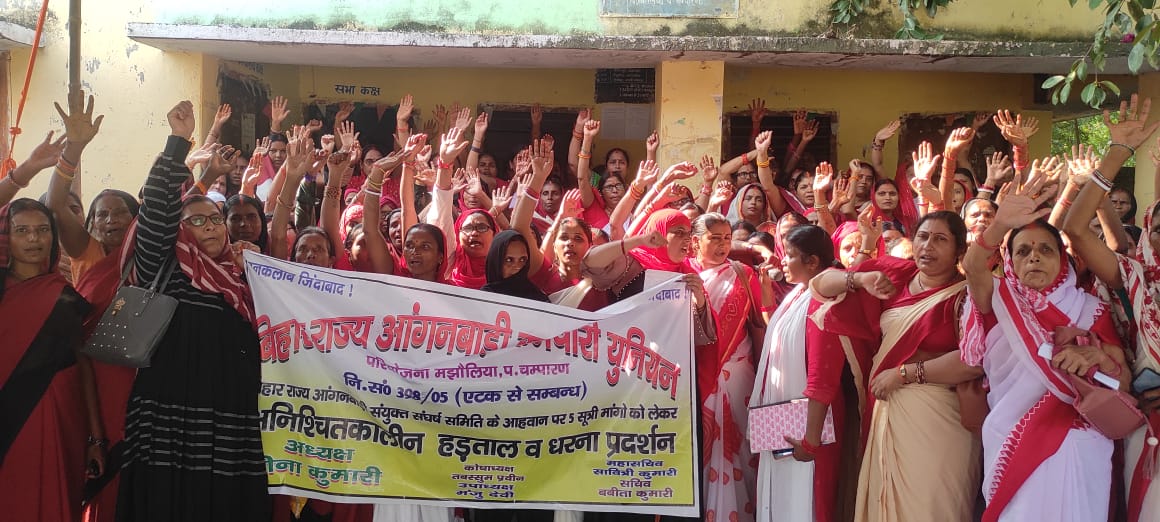 मझौलिया।” बिहार सरकार खोलो कान,नही तो होगा चक्का जाम”।प्रखण्ड की आंगनबाड़ी सेविकाएं तथा सहायिकाओं ने इन्ही नारों के साथ सीडीपीओ कार्यालय मझौलिया में तालाबंदी कर विरोध जताया।मांगो के समर्थन में सेविकाएँ आगामी 02 नवंबर से 06 नवंबर तक जिला मुख्यालय पर धरना प्रदर्शन करेंगी।इस पर भी सरकार अगर मांगे पपूरा नही करेंगी तो पटना में 30 नवंबर से घेरा डालो डेरा डालो कार्यक्रम आयोजित किया जायेगा।यह कहना है बिहार राज्य आंगनबाड़ी संघर्ष समिति की मझौलिया प्रखण्ड अध्यक्ष रीना कुमारी का।आईसीडीएस कार्यालय मझौलिया में बिगत 29 सिंतबर से वेतनमान की मांग पर धरना प्रदर्शन कर रही है।सूबे की सरकार को चुनाव में सबक सिखाने का शंखनाद किया गया साथ ही सरकार विरोधी नारे लगाये गये।सचिव बबिता कुमारी ने कहा कि वेतनमान लागू नही करने की स्थिति में सेविकाओं को 25 हजार2 तथा सहायिकाओं को 18 हजार तत्काल मानदेय किया जाये।उन्होंने सरकार पर वादा खिलाफी का आरोप लगाया।मौके पर तब्बसुम प्रवीण,संगीता देवी,पूनम रानी,लालसा देवी,किरण उपाध्याय,शबनम आरा आदि ने धरना को संबोधित किया।सेविकाएँ बड़ी आक्रामक नजर आयी।