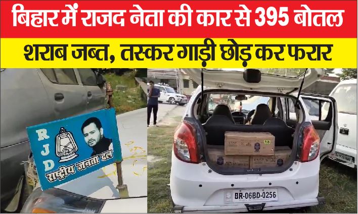 बिहार में आम तो आम अब खास लोग भी शराब की तस्करी के काम में लग गए है। ताजा मामला बिहार के मोतिहारी जिले से सामने आया है जहाँ जिले में एक कार से 395 बोतल शराब मिली। कार पर राष्ट्रीय जनता दल का झंडा लगा हुआ है। जबकि सामने जिला सचिव का बोर्ड लगा है। मोतिहारी पुलिस और एक्साइज पुलिस टीम ने संयुक्त कार्रवाई करते हुए यह बड़ी सफलता हासिल की है वही पुलिस को देख तस्कर कार छोड़ कर भाग निकले।
