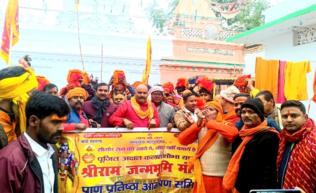 मोतिहारी : श्री अयोध्या से आए पुजित कलश अक्षत को लेकर आज राम जन्म भूमि प्राण प्रतिष्ठा आमत्रंण समिति के तत्वावधान मे अजगरी मठ से विशाल शोभा यात्रा निकल कर अमवा सिसवा शनीचरी स्थान होते हुए गोखूला मठ पर समाप्त हुआ। रास्ते भर गगन भेदी जय श्रीराम के नारे लगते रहे और फूल की वर्षा होती रही। जगह जगह शोभा यात्रा पर गांव वालो द्वारा पुष्प की वर्षा हुई और सभी शोभा यात्रा मे शामिल होते गए। यात्रा मे बडी संख्या मे महिलाए शामिल थी। शोभा यात्रा का नेतृत्व समिति के जिला सदस्य आलोक चन्द और मनोरंजन प्रसाद कर रहे थे वंही हरेन्द्र प्रसाद शोभा यात्रा की सफलता के लिए काफी सक्रिय थे। मौके पर प्रमोद शंकर सिंह और पूर्व एम एल सी मोतिहारी बबलू गुप्ता भी शोभा यात्रा मे शामिल हुए।