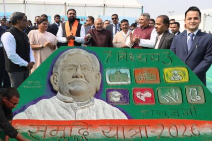 समृद्धि यात्रा में सैंड आर्टिस्ट मधुरेंद्र की कलाकृति की सराहना करते सीएम…